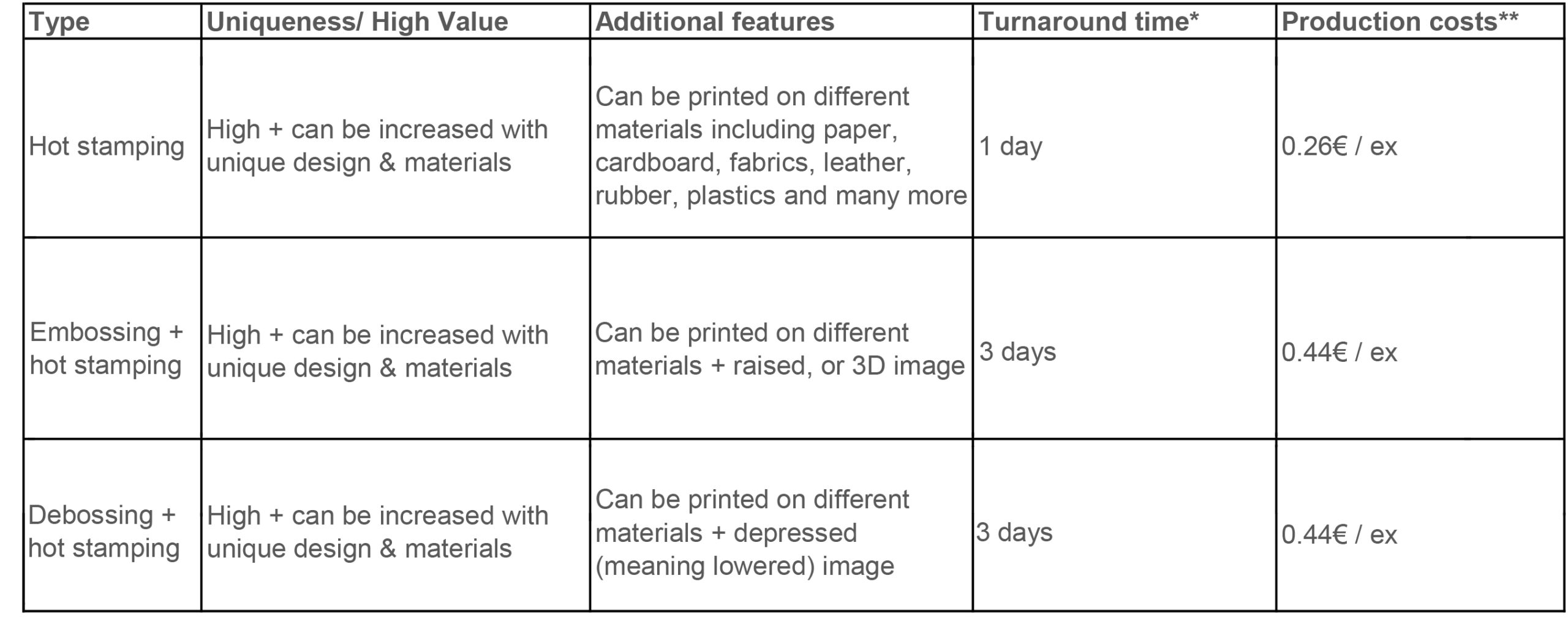 * The technical details, which make each process more or less difficult to apply, but which do not directly concern the customer (for example: the inevitable elaboration of a matrix for the embossing, change of machines, sheet yield used for cushioning) are indicated and translated in the table as differences in “turnaround time”.