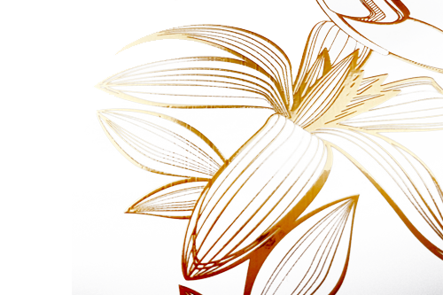 Quality: the perfect adhesion between the glue and the silicone film, even on a tiny surface, avoids micro-cracks in the gilding and the removal of film of standard hot stamping. The “Silk Foil” gilded elements, even the most delicate ones, have homogeneous, smooth and stable surfaces and edges. The nature of the process preserves any gap between embossing and gilding, even on extremely fine lines – a quality that is difficult to achieve with the traditional “embossing + hot stamping” combination.